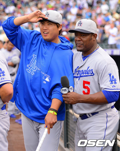 [OSEN=덴버(미국), 곽영래 기자] 5일(한국시간) 미국 콜로라도주 덴버 쿠어스필드에서 열린 2013 미국 메이저리그 콜로라도 로키스와 LA 다저스의 경기에 앞서 다저스 우리베와 류현진이 마이크를 가지고 장난을 치고 있다