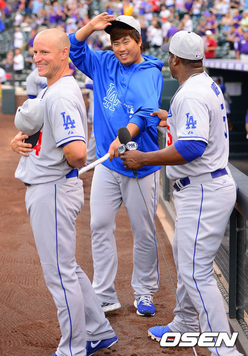 [OSEN=덴버(미국), 곽영래 기자] 5일(한국시간) 미국 콜로라도주 덴버 쿠어스필드에서 열린 2013 미국 메이저리그 콜로라도 로키스와 LA 다저스의 경기에 앞서 다저스 우리베와 류현진이 마이크를 가지고 장난을 치고 있다