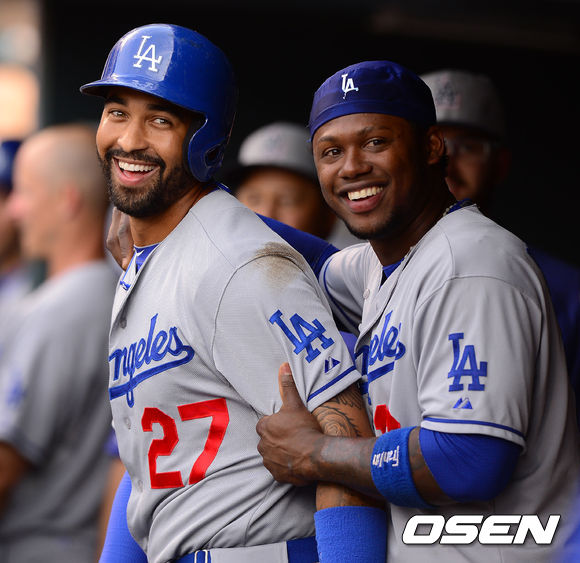 [OSEN=덴버(미국), 곽영래 기자] 5일(한국시간) 미국 콜로라도주 덴버 쿠어스필드에서 열린 2013 미국 메이저리그 콜로라도 로키스와 LA 다저스의 경기, 2회초 무사 1루 다저스 맷 켐프가 역전 2점 홈런을 날리고 라미레스와 카메라를 바라보고 있다