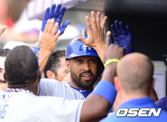[OSEN=덴버(미국), 곽영래 기자] 5일(한국시간) 미국 콜로라도주 덴버 쿠어스필드에서 열린 2013 미국 메이저리그 콜로라도 로키스와 LA 다저스의 경기, 2회초 무사 1루 다저스 맷 켐프가 역전 2점 홈런을 날리고 동료들의 축하를 받고 있다