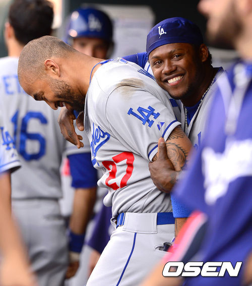 [OSEN=덴버(미국), 곽영래 기자] 5일(한국시간) 미국 콜로라도주 덴버 쿠어스필드에서 열린 2013 미국 메이저리그 콜로라도 로키스와 LA 다저스의 경기, 2회초 무사 1루 다저스 맷 켐프가 역전 2점 홈런을 날리고 라미레스의 장난에 쑥스러워하고 있다