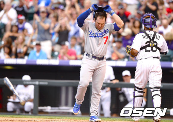 [OSEN=덴버(미국), 곽영래 기자] 5일(한국시간) 미국 콜로라도주 덴버 쿠어스필드에서 열린 2013 미국 메이저리그 콜로라도 로키스와 LA 다저스의 경기, 3회초 2사 만루 찬스를 놓친 다저스 푼토가 방망이와 헬멧을 던지며 아쉬워하고 있다