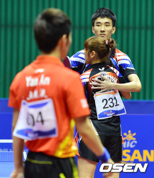 5일 오전 부산 사직실내체육관에서 열린 제 21회 아시아 탁구선수권대회 혼합복식 4강전에서 대한민국 이상수(삼성생명)-박영숙(KRA한국마사회) 조가 중국의 얀안(세계 12위)-주율링(세계 5위) 조에 4-3 승리를 거두고 결승에 진출했다.