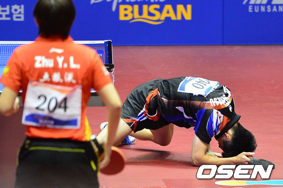 5일 오전 부산 사직실내체육관에서 열린 제 21회 아시아 탁구선수권대회 혼합복식 4강전에서 대한민국 이상수(삼성생명)-박영숙(KRA한국마사회) 조가 중국의 얀안(세계 12위)-주율링(세계 5위) 조에 4-3 승리를 거두고 결승에 진출했다.