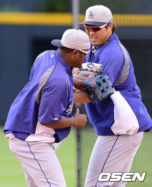 [OSEN=덴버(미국), 곽영래 기자] 5일(한국시간) 미국 콜로라도주 덴버 쿠어스필드에서 열린 2013 미국 메이저리그 콜로라도 로키스와 LA 다저스의 경기에 앞서 류현진과 우리베가 장난을 치고 있다