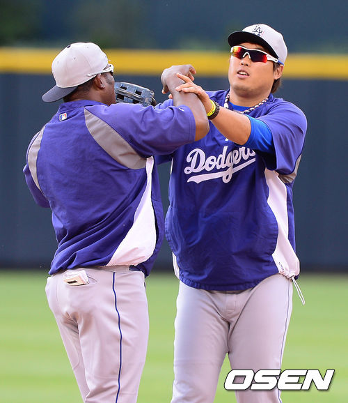 [OSEN=덴버(미국), 곽영래 기자] 6일(한국시간) 미국 콜로라도주 덴버 쿠어스필드에서 열린 2013 미국 메이저리그 콜로라도 로키스와 LA 다저스의 경기에 앞서 다저스 류현진과 우리베가 장난을 치고 있다