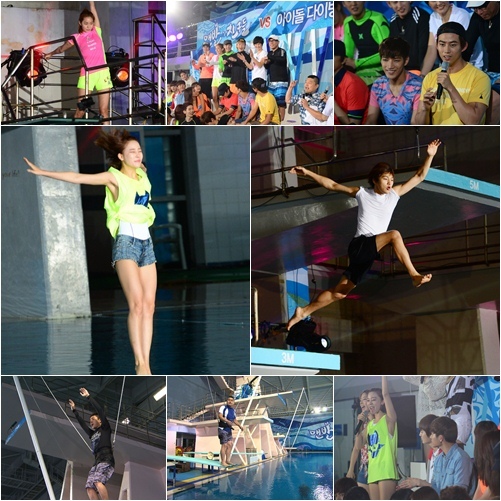 아이돌들의 겁 없는 도전장을 받은 SBS 예능프로그램 '일요일이 좋다-맨발의 친구들' 팀은 최근 직접 다이빙 대회를 개최해 2PM, 2AM, 씨스타, 엠블랙, 인피니트, 레인보우 등과 수영장을 찾았다.