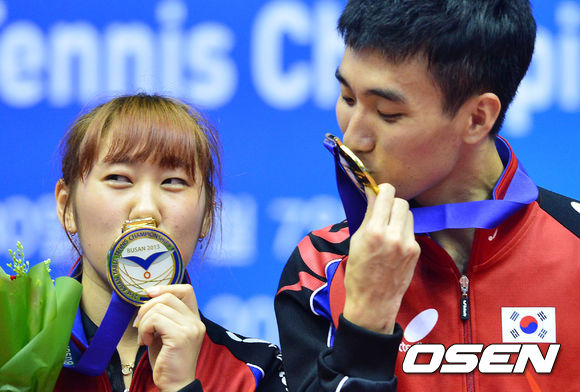 5일 오후 부산 사직실내체육관에서 열린 제 21회 아시아 탁구선수권대회 혼합복식 결승에서 대한민국 이상수(삼성생명)-박영숙(KRA한국마사회) 조가 일본의 니와 코키(세계19위)-히라노 사야카(세계32위) 조를 4-0으로 꺾고 우승을 차지했다.
