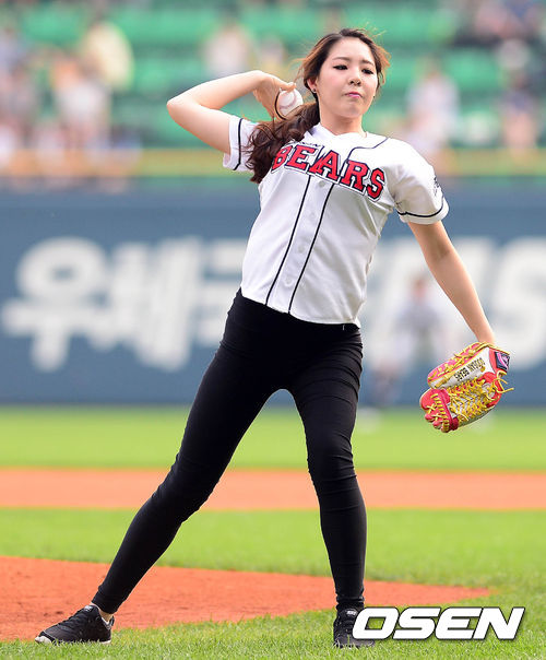 5일 오후 서울 잠실구장에서 열린 '2013 한국야쿠르트 세븐 프로야구' 두산 베어스와 삼성 라이온즈의 경기 시작 전 전 리듬체조 선수 신수지가 시구를 하고 있다.