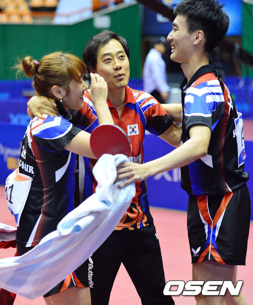 5일 오후 부산 사직실내체육관에서 열린 제 21회 아시아 탁구선수권대회 혼합복식 결승에서 대한민국 이상수(삼성생명)-박영숙(KRA한국마사회) 조가 일본의 니와 코키(세계19위)-히라노 사야카(세계32위) 조를 4-0으로 꺾고 우승을 차지했다.