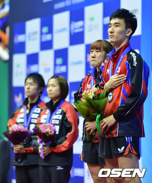 5일 오후 부산 사직실내체육관에서 열린 제 21회 아시아 탁구선수권대회 혼합복식 결승에서 대한민국 이상수(삼성생명)-박영숙(KRA한국마사회) 조가 일본의 니와 코키(세계19위)-히라노 사야카(세계32위) 조를 4-0으로 꺾고 우승을 차지했다.