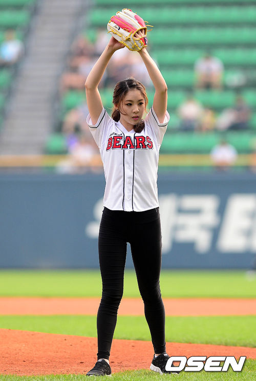 5일 오후 서울 잠실구장에서 열린 '2013 한국야쿠르트 세븐 프로야구' 두산 베어스와 삼성 라이온즈의 경기 시작 전 신수지가 시구를 하고 있다.