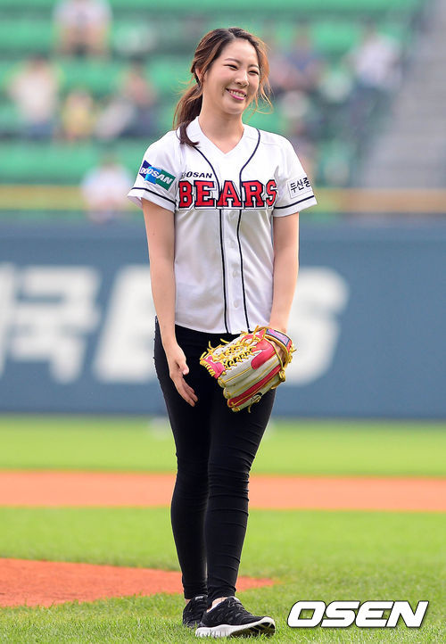 5일 오후 서울 잠실구장에서 열린 '2013 한국야쿠르트 세븐 프로야구' 두산 베어스와 삼성 라이온즈의 경기 시작 전 신수지가 시구를 한 후 미소를 짓고 있다.
