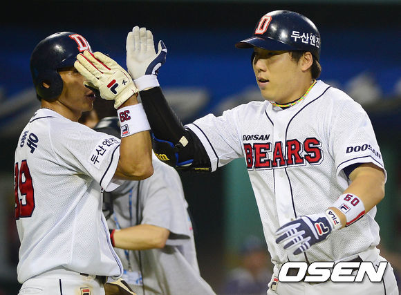 5일 오후 서울 잠실구장에서 열린 '2013 한국야쿠르트 세븐 프로야구' 두산 베어스와 삼성 라이온즈의 경기 4회말 1사 1,2루 김현수가 스리런포를 친 후 이종욱과 하이파이브하고 있다.