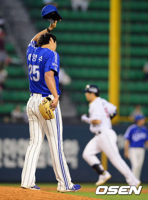 5일 오후 서울 잠실구장에서 열린 '2013 한국야쿠르트 세븐 프로야구' 두산 베어스와 삼성 라이온즈의 경기 4회말 1사 1,2루 김현수에게 스리런포를 내준 배영수가 마운드에서 땀을 닦고 있다.