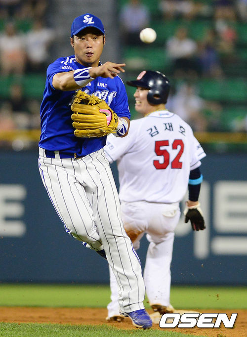 5일 오후 서울 잠실구장에서 열린 '2013 한국야쿠르트 세븐 프로야구' 두산 베어스와 삼성 라이온즈의 경기 5회말 1사 1루 이종욱의 내야땅볼 상황, 김태완이 1루주자 김재호를 태그아웃 시킨 후 1루로 송구하고 있다.