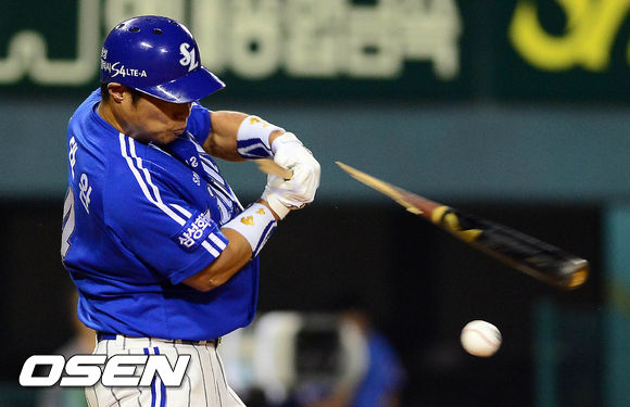 5일 오후 서울 잠실구장에서 열린 '2013 한국야쿠르트 세븐 프로야구' 두산 베어스와 삼성 라이온즈의 경기 8회초 선두타자 김태완이 내야땅볼을 치면서 배트가 부러지고 있다.