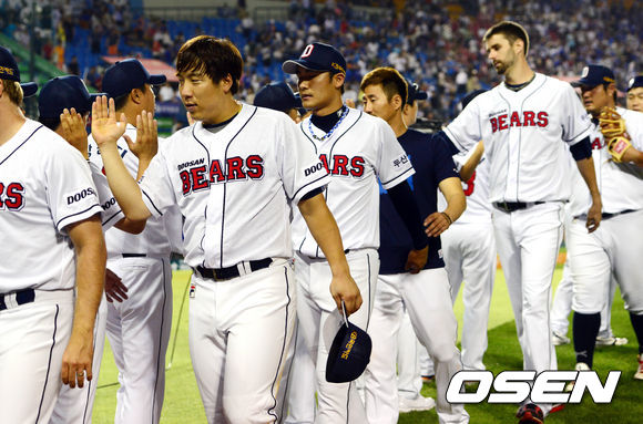 5일 오후 서울 잠실구장에서 열린 '2013 한국야쿠르트 세븐 프로야구' 두산 베어스와 삼성 라이온즈의 경기 종료 후 선수들이 하이파이브를 하고 있다.