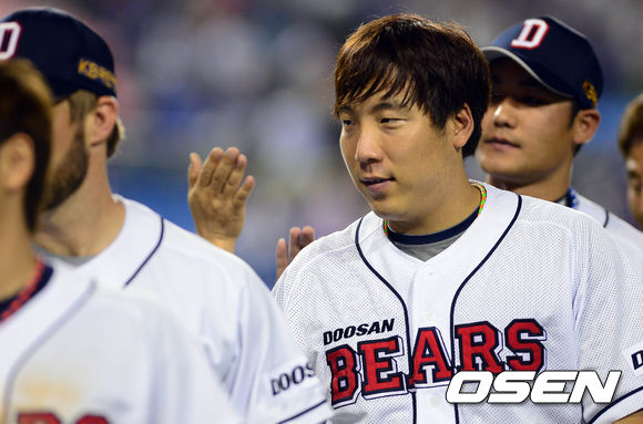 5일 오후 서울 잠실구장에서 열린 '2013 한국야쿠르트 세븐 프로야구' 두산 베어스와 삼성 라이온즈의 경기 종료 후 김현수가 동료들과 하이파이브를 하고 있다.