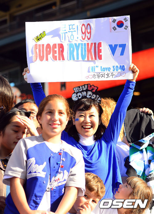 [OSEN=샌프란시스코, 곽영래 기자] 6일(한국시간) 미국 캘리포니아주 샌프란시스코에서 열린 2013 메이저리그 샌프란시스코 자이언츠와 LA 다저스의 경기에 앞서 한 교민이 류현진을 응원하는 문구를 들고 포즈를 취하고 있다.