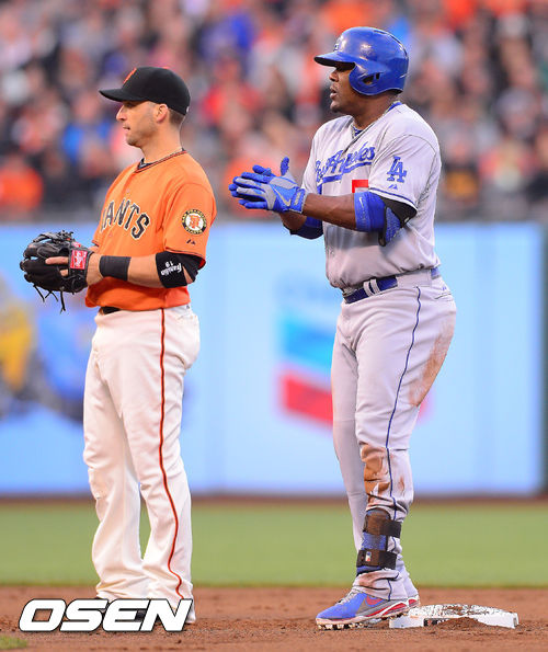 [OSEN=샌프란시스코, 곽영래 기자] 6일(한국시간) 미국 캘리포니아주 샌프란시스코에서 열린 2013 메이저리그 샌프란시스코 자이언츠와 LA 다저스의 경기, 2회초 1사 주자 만루 LA 다저스 후안 우리베가 좌전 2타점 적시타를 날린 후 2루에서 박수를 보내고 있다.