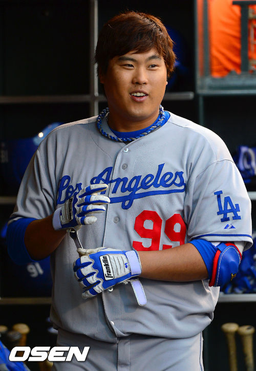 [OSEN=샌프란시스코, 곽영래 기자] 6일(한국시간) 미국 캘리포니아주 샌프란시스코에서 열린 2013 메이저리그 샌프란시스코 자이언츠와 LA 다저스의 경기, 2회초 1사 주자 2,3루 LA 다저스 류현진이 삼진 아웃을 당한 후 덕아웃에서 미소 짓고 있다.