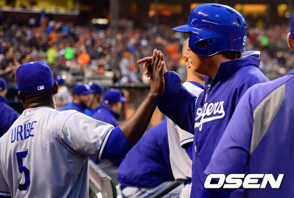 [OSEN=샌프란시스코, 곽영래 기자] 6일(한국시간) 미국 캘리포니아주 샌프란시스코에서 열린 2013 메이저리그 샌프란시스코 자이언츠와 LA 다저스의 경기, 3회초를 마치고 3회초에 1타점 적시타를 날린 류현진과 3타점 싹쓸이 적시타를 날린 우리베가 덕아웃에서 하이파이브를 하고 있다.