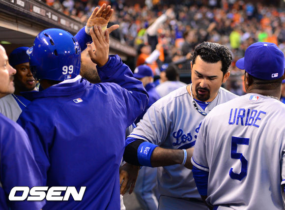 [OSEN=샌프란시스코, 곽영래 기자] 6일(한국시간) 미국 캘리포니아주 샌프란시스코에서 열린 2013 메이저리그 샌프란시스코 자이언츠와 LA 다저스의 경기, 3회초를 마치고 3회초에 1타점 적시타를 날린 류현진이 곤살레스와 기쁨을 나누고 있다.