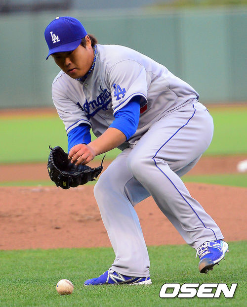 [OSEN=샌프란시스코, 곽영래 기자] 6일(한국시간) 미국 캘리포니아주 샌프란시스코에서 열린 2013 메이저리그 샌프란시스코 자이언츠와 LA 다저스의 경기, 1회말 샌프란시스코 선두 타자 안드레스 토레스가 내야안타를 날리자 LA 다저스 선발 류현진이 달려나오고 있다.