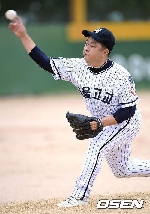 6일 오후 경기도 김포시 송일야구장에서 열린 '제4회 니베아 맨 컵 전국생활체육 야구대회' 32강 서울고 동문야구단과 야놀베이스볼의 경기, 1회초 서울고 동문야구단 윤지환이 역투하고 있다.