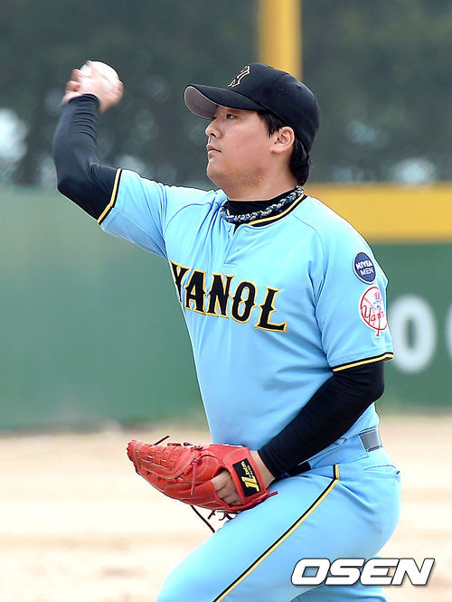 6일 오후 경기도 김포시 송일야구장에서 열린 '제4회 니베아 맨 컵 전국생활체육 야구대회' 32강 서울고 동문야구단과 야놀베이스볼의 경기, 1회말 야놀베이스볼 정우진이 역투하고 있다.