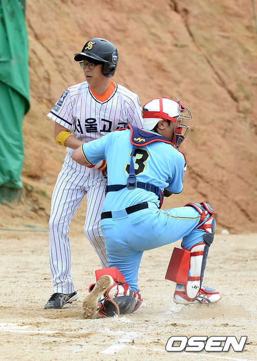 6일 오후 경기도 김포시 송일야구장에서 열린 '제4회 니베아 맨 컵 전국생활체육 야구대회' 32강 서울고 동문야구단과 야놀베이스볼의 경기, 1회초 무사 2루 야놀베이스볼 정명훈이 홈으로 쇄도하는 서울고 동문야구단 김경훈을 태그아웃으로 잡아내고 있다.