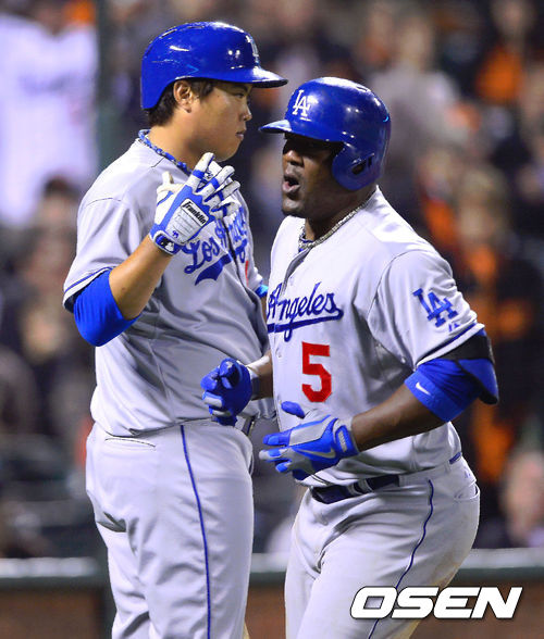 [OSEN=샌프란시스코, 곽영래 기자] 6일(한국시간) 미국 캘리포니아주 샌프란시스코에서 열린 2013 메이저리그 샌프란시스코 자이언츠와 LA 다저스의 경기, 7회초 무사 주자 1루 LA 다서스 후안 유리베가 좌중월 투런 홈런을 날린 후 홈을 밟고 류현진과 하이파이브를 하고 있다.