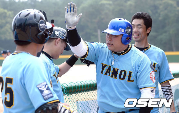 6일 오후 경기도 김포시 송일야구장에서 열린 '제4회 니베아 맨 컵 전국생활체육 야구대회' 32강 서울고 동문야구단과 야놀베이스볼의 경기, 3회초 득점을 올린 야놀베이스 선수들이 기뻐하고 있다.