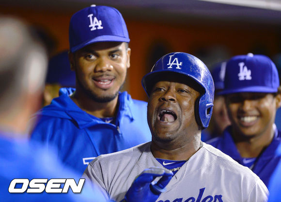 [OSEN=샌프란시스코, 곽영래 기자] 6일(한국시간) 미국 캘리포니아주 샌프란시스코에서 열린 2013 메이저리그 샌프란시스코 자이언츠와 LA 다저스의 경기, 7회초 무사 주자 1루 LA 다서스 후안 유리베가 좌중월 투런 홈런을 날린 후 덕아웃에서 동료들과 기쁨을 나누고 있다.