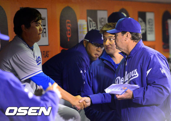 [OSEN=샌프란시스코, 곽영래 기자] 6일(한국시간) 미국 캘리포니아주 샌프란시스코에서 열린 2013 메이저리그 샌프란시스코 자이언츠와 LA 다저스의 경기, 7회말 2사 주자 2루 샌프란시스코 아브레이유 타석에서 마운드를 내려간 LA 다저스 선발 류현진이 덕아웃에서 릭 허니컷 투수코치와 악수를 나누고 있다.