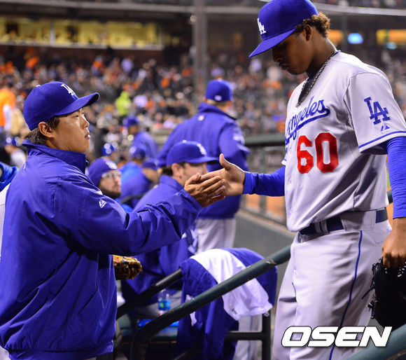 [OSEN=샌프란시스코, 곽영래 기자] 6일(한국시간) 미국 캘리포니아주 샌프란시스코에서 열린 2013 메이저리그 샌프란시스코 자이언츠와 LA 다저스의 경기, 7회말 2사 주자 2루 샌프란시스코 아브레이유 타석에서 마운드를 내려간 LA 다저스 선발 류현진이 7회를 마무리한 도밍게스와 하이파이브를 하고 있다.