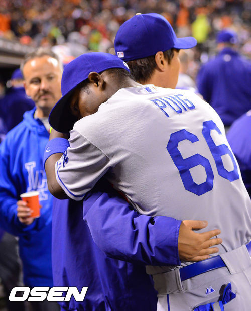 [OSEN=샌프란시스코, 곽영래 기자] 6일(한국시간) 미국 캘리포니아주 샌프란시스코에서 열린 2013 메이저리그 샌프란시스코 자이언츠와 LA 다저스의 경기, 7회말 2사 주자 2루 샌프란시스코 아브레이유 타석에서 마운드를 내려간 LA 다저스 선발 류현진이 푸이그와 포옹을 하고 있다.
