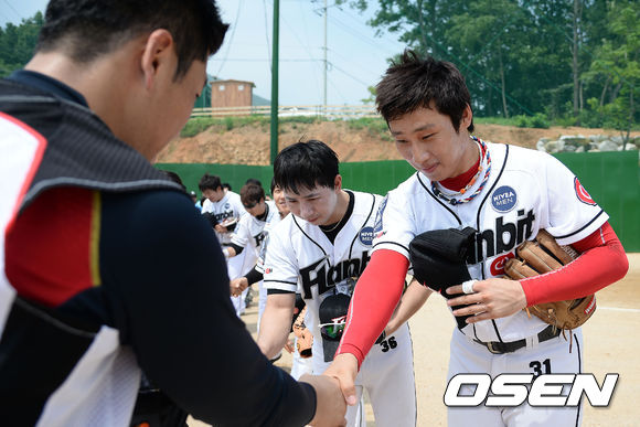 6일 오후 경기도 김포시 송일야구장에서 열린 '제4회 니베아 맨 컵 전국생활체육 야구대회' 32강 한빛소프트와 GMB의 경기전 양팀 선수들이 악수를 나누고 있다.