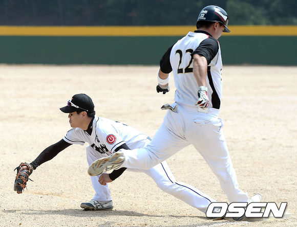 6일 오후 경기도 김포시 송일야구장에서 열린 '제4회 니베아 맨 컵 전국생활체육 야구대회' 32강 한빛소프트와 GMB의 경기, 1회초 GMB 이계창이 1루에서 아웃당하고 있다.