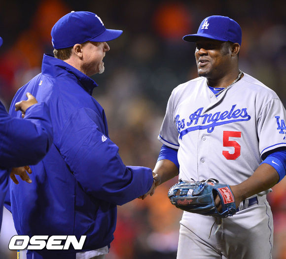 경기종료 후 맹활약을 펼친 다저스 우리베가 맥과이어 코치와 하이파이브를 하고 있다. / soul1014@osen.co.kr