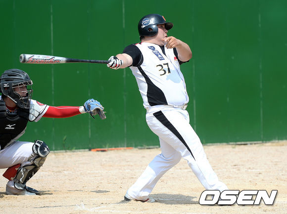 6일 오후 경기도 김포시 송일야구장에서 열린 '제4회 니베아 맨 컵 전국생활체육 야구대회' 32강 한빛소프트와 GMB의 경기, GMB 박수영이 희생플라이로 타점을 올리고 있다.