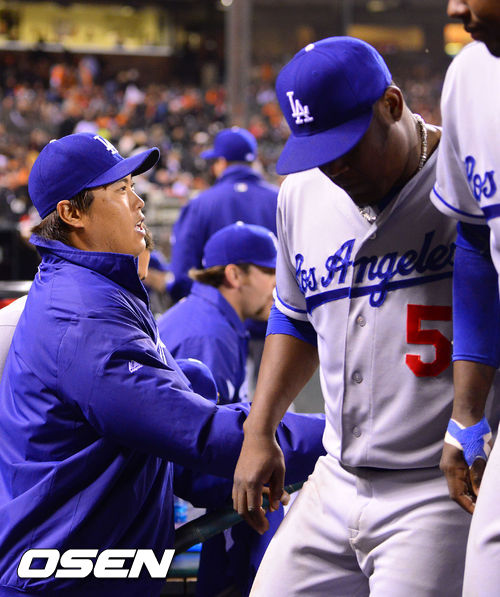 7회말 이닝종료 후 다저스 류현진이 우리베 엉덩이를 두들기며 격려하고 있다. / soul1014@osen.co.kr