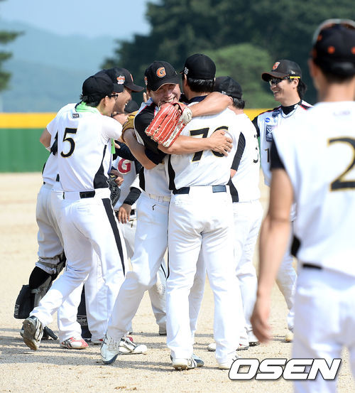 경기 종료 후 승리를 거둔 GMB 선수들이 기뻐하고 있다.