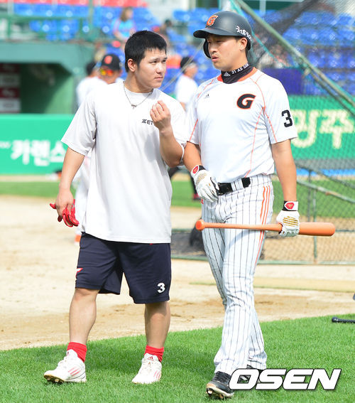 6일 오후 광주 무등경기장에서 열리는 '2013 한국야쿠르트 세븐 프로야구' KIA 타이거즈와 롯데 자이언츠의 경기를 앞두고 KIA 김선빈이 롯데 손아섭과 대화를 나누고 있다.