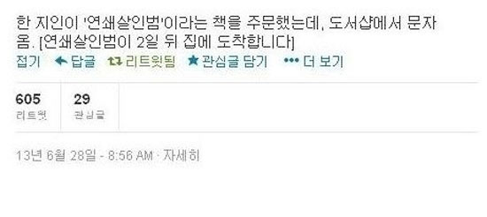 한 네티즌이 트윗을 캡처한 사진 속에는 "한 지인이 '연쇄살인범'이라는 책을 주문했는데 도서샵에서 문자옴. '연쇄살인범이 이틀 뒤 집에 도착합니다'"라는 글이 적혀 있다.