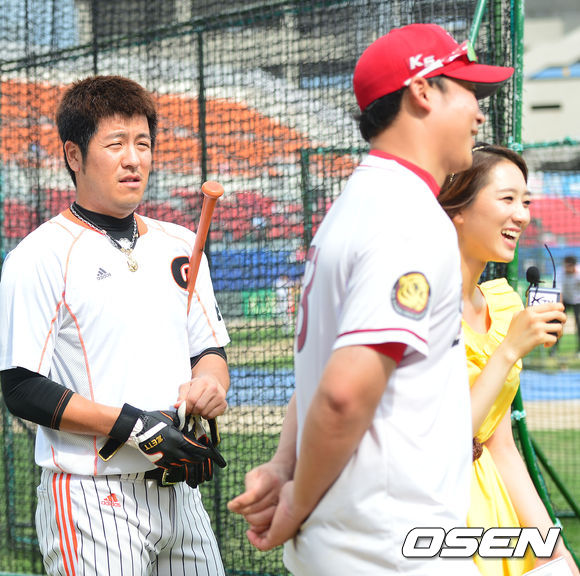 6일 오후 광주 무등경기장에서 열리는 '2013 한국야쿠르트 세븐 프로야구' KIA 타이거즈와 롯데 자이언츠의 경기를 앞두고 롯데 강민호가 인터뷰 중인 KIA 김주형과 조유영 아나운서에게 장난을 걸고 있다.