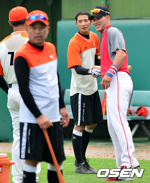 6일 오후 대전구장에서 열리는 '2013 한국야쿠르트 세븐 프로야구' 한화 이글스와 SK 와이번스의 경기에 앞서 한화 추승우와 SK 김상현이 반갑게 인사를 나누고 있다.