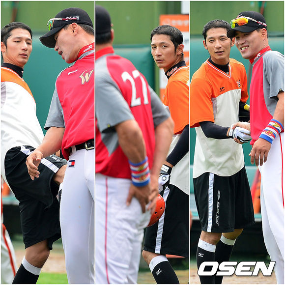 6일 오후 대전구장에서 열리는 '2013 한국야쿠르트 세븐 프로야구' 한화 이글스와 SK 와이번스의 경기에 앞서 한화 추승우와 SK 김상현이 인사를 나누며 장난을 치고 있다.