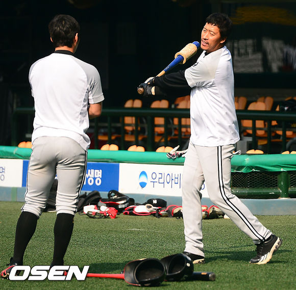 6일 오후 목동구장에서 2013 한국야쿠르트 세븐프로야구 넥센 히어로즈와 LG 트윈스의 경기가 열릴 예정인 가운데, 훈련시간에 LG 이병규가 스윙연습을 하고 있다.